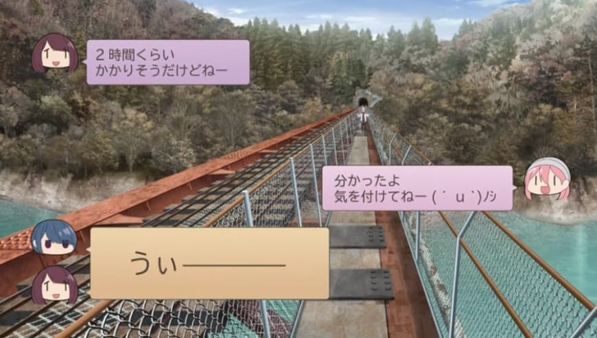 なでしこの鉄道一人旅が佳境に入ったこの話では、なでしこが目的の駅に着いた後、吊り橋を渡ってキャンプ場へ向かうはずでした。